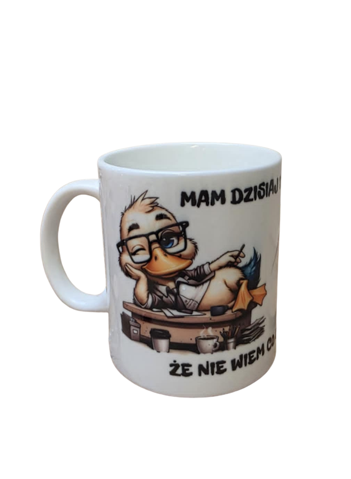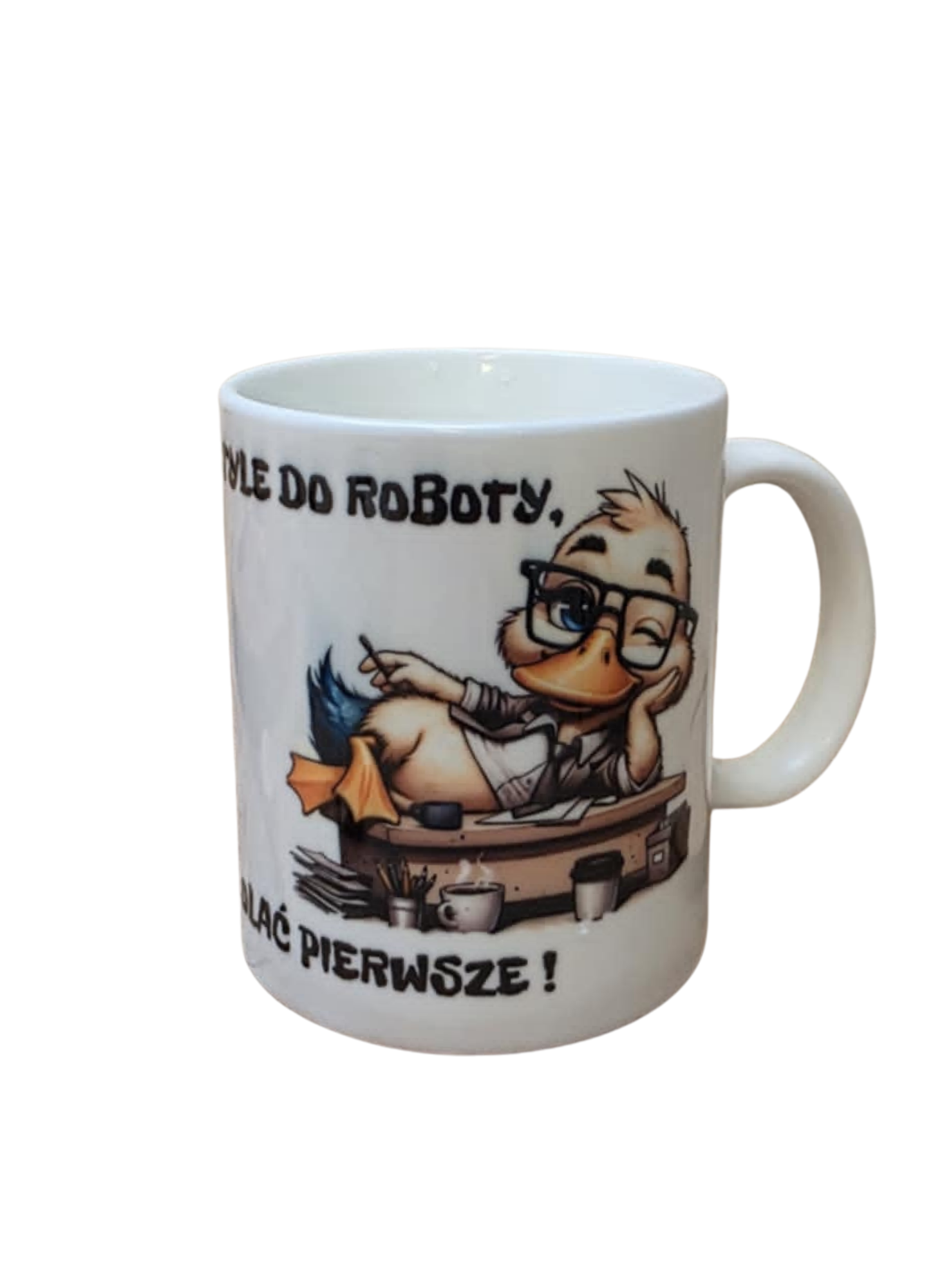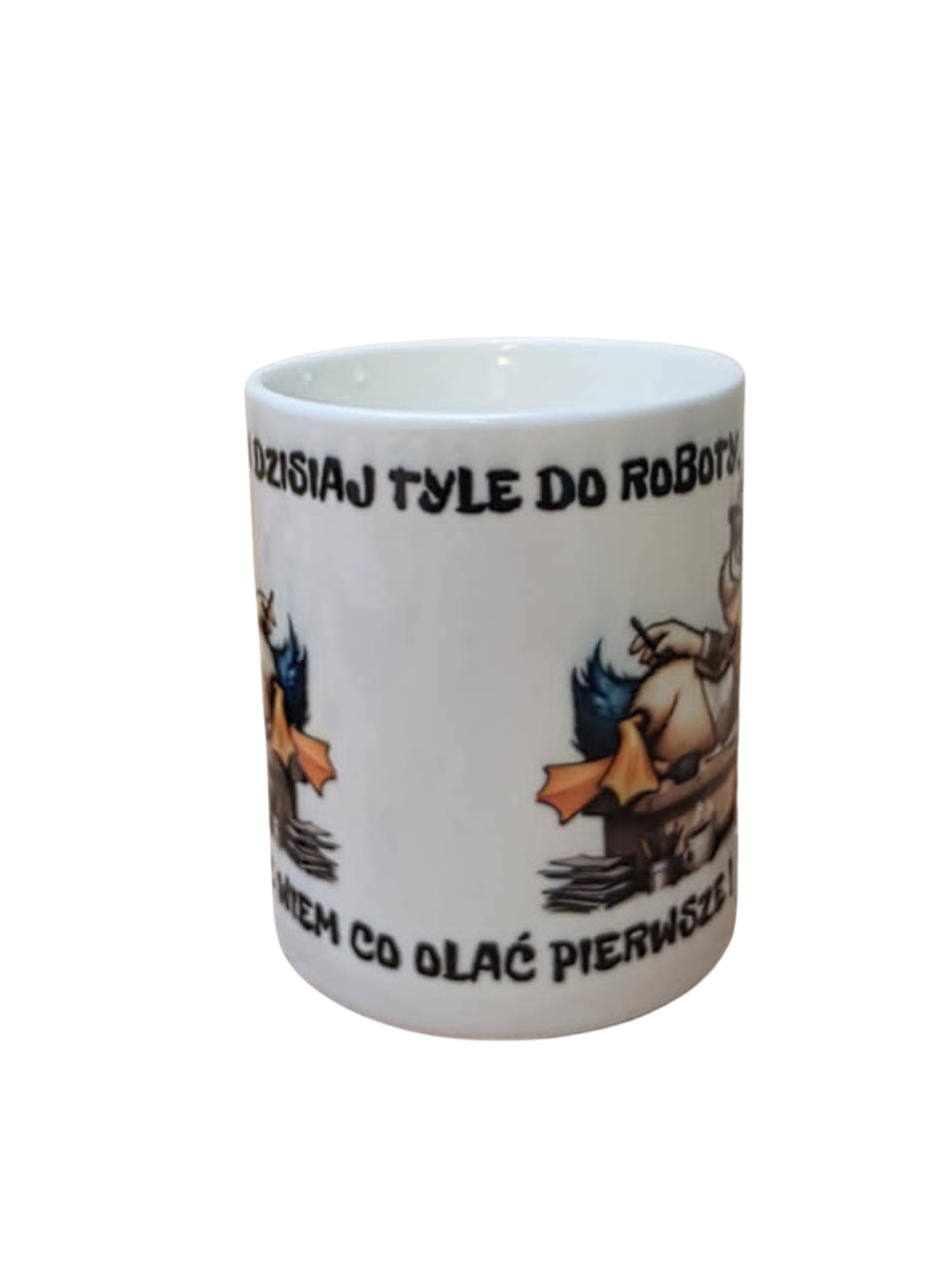 Opis: Kubek z charakterystyczną grafiką i napisem „Mam dzisiaj tyle do roboty, że nie wiem co olać pierwsze”