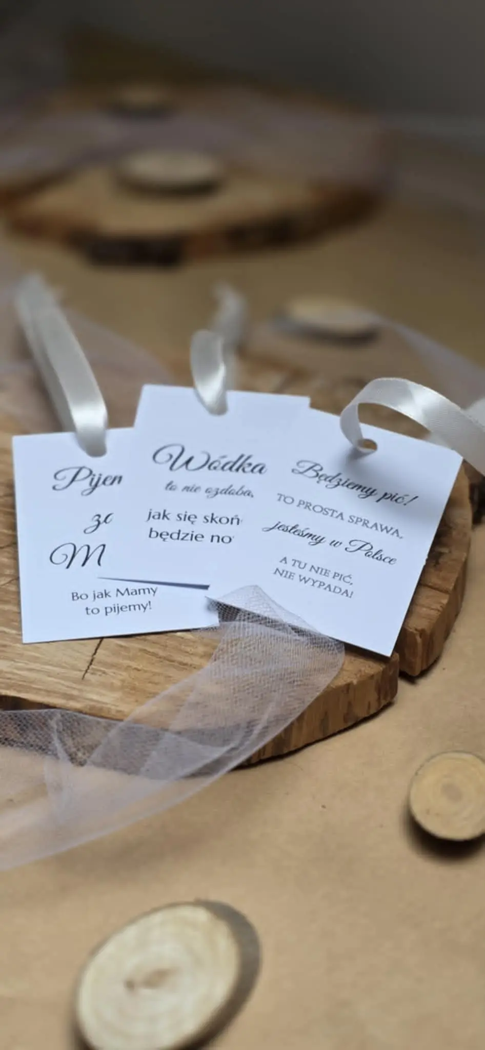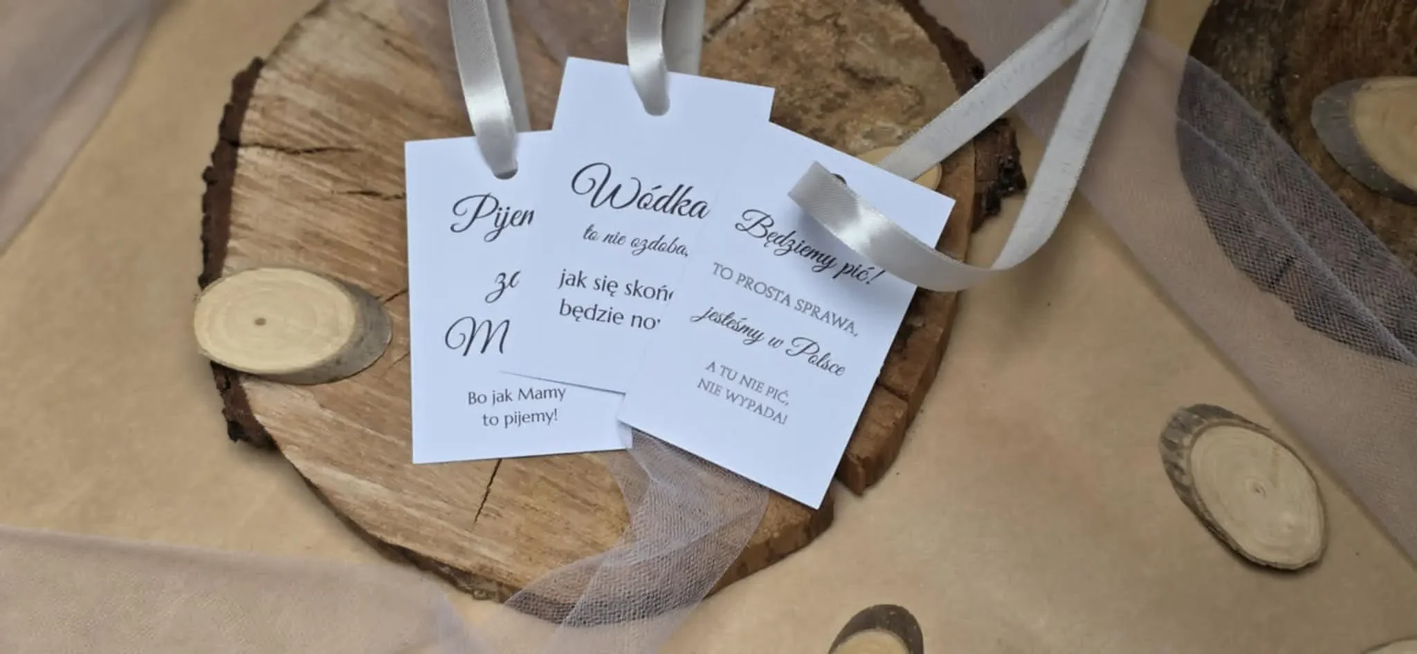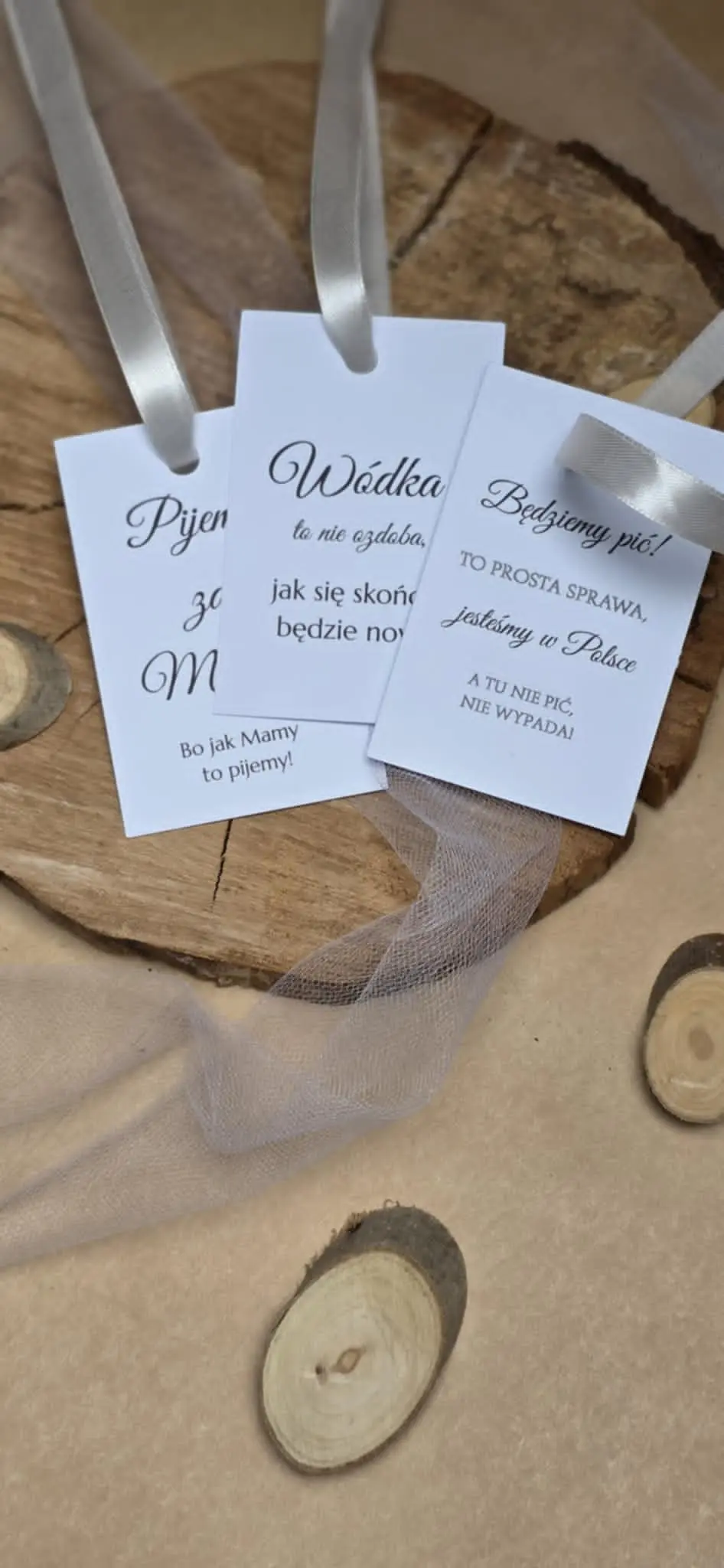 Oferujemy zawieszki z gotowymi wzorami i tekstami – eleganckimi, z humorem lub tekstami piosenek. Zawieszki podkreślą charakter uroczystości i zadbają o każdy detal na stole. Wystarczy wybrać motyw, który najbardziej pasuje do Twojej okazji.